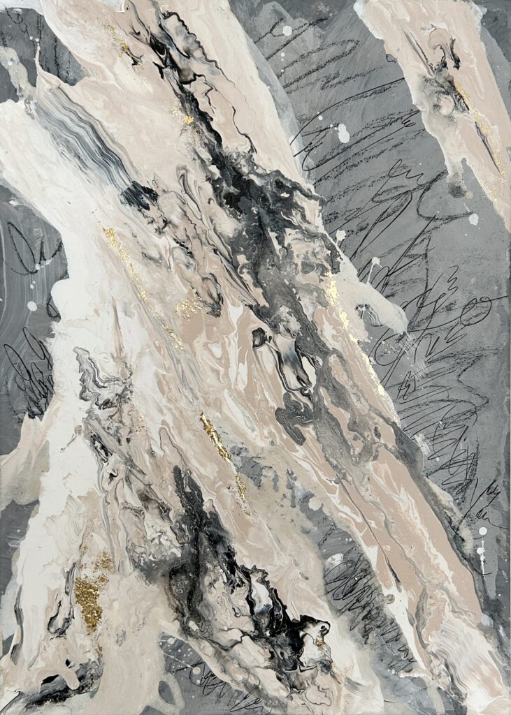 „Space in between“ ° 2025 / 50x70x1,8 cm; Acryl, Goldblätter, Tinte und Kohlestift auf Leinwand